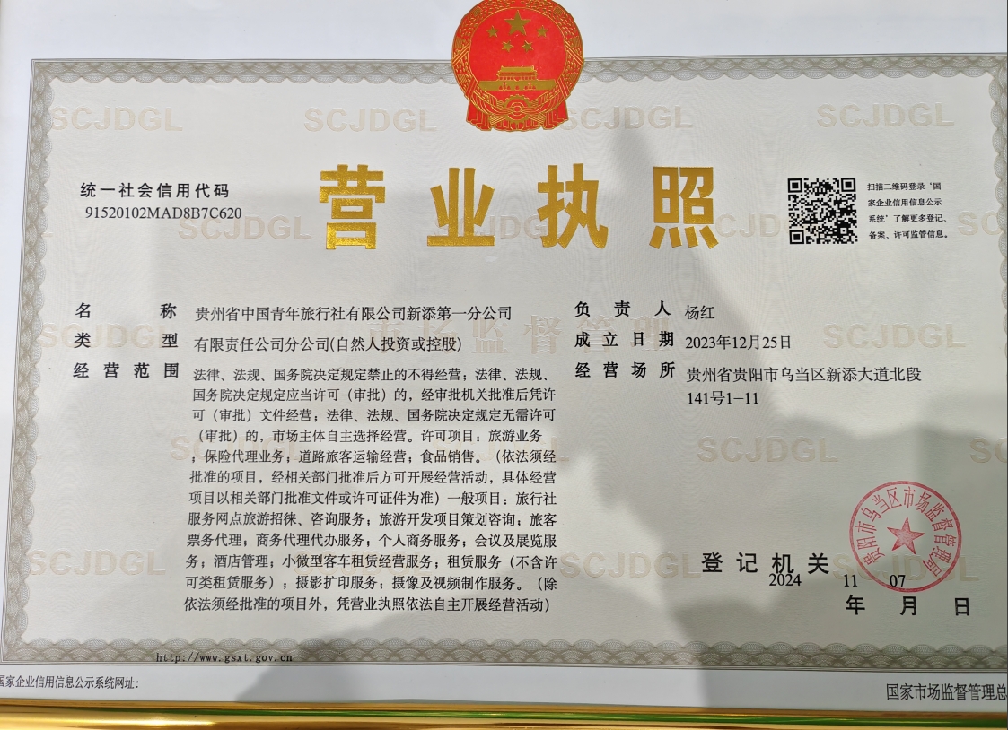 贵州省中国青年旅行社有限公司新添第一分公司营业执照