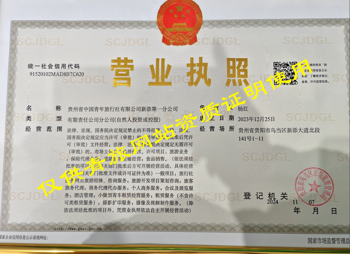 贵州省中国青年旅行社有限公司新添第一分公司营业执照